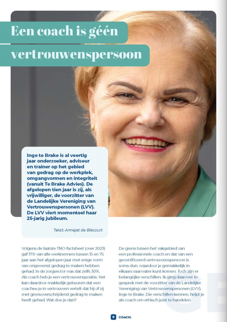 Het werkveld van een coach en vertrouwenspersoon ligt dicht bij elkaar. Wat zijn de verschillen en waarom is het belangrijk om die rollen gescheiden te houden? Dit interview met Inge te Brake, voorzitter van de Landelijke Vereniging van Vertrouwenspersonen geeft meer inzicht.
